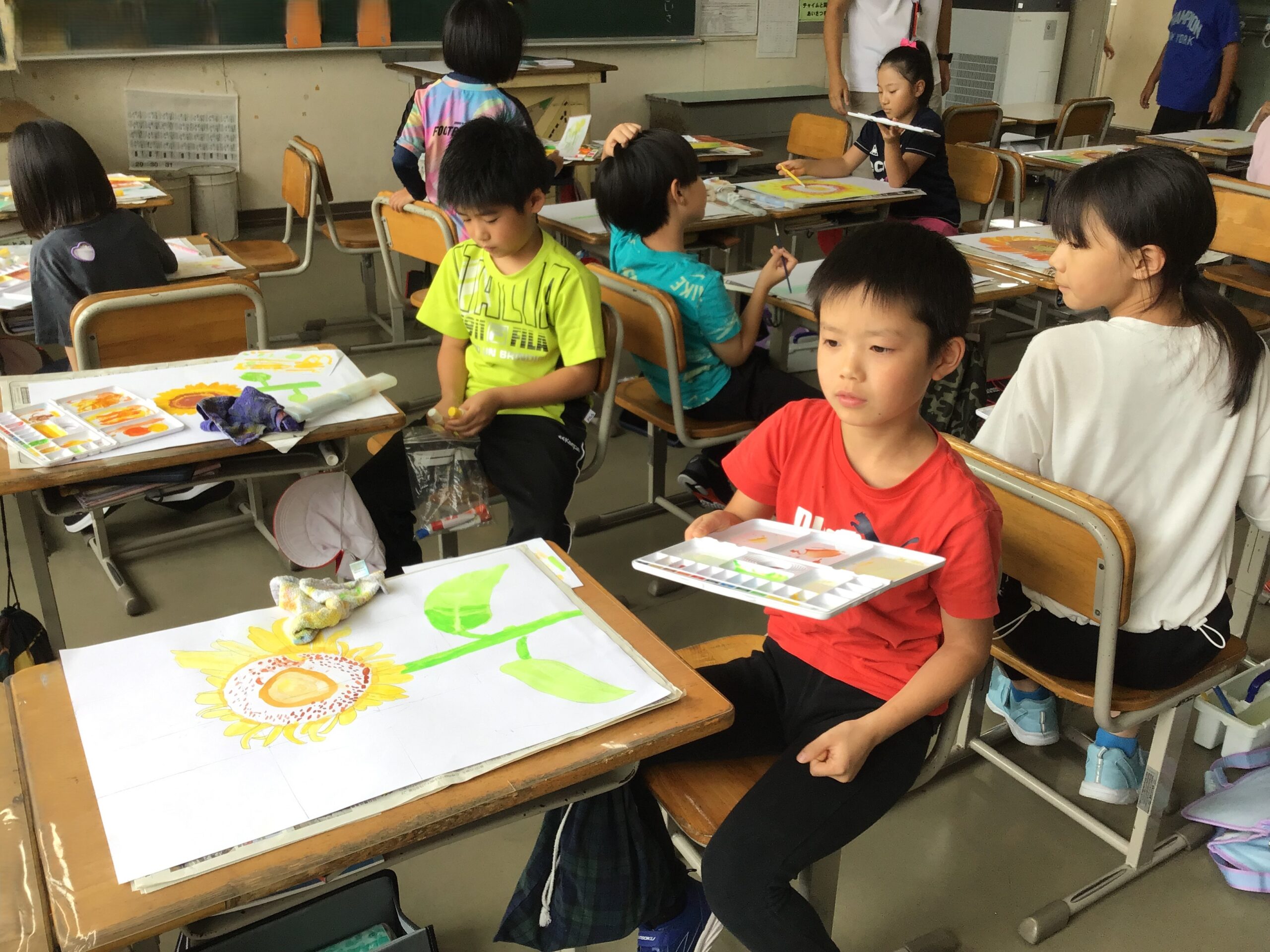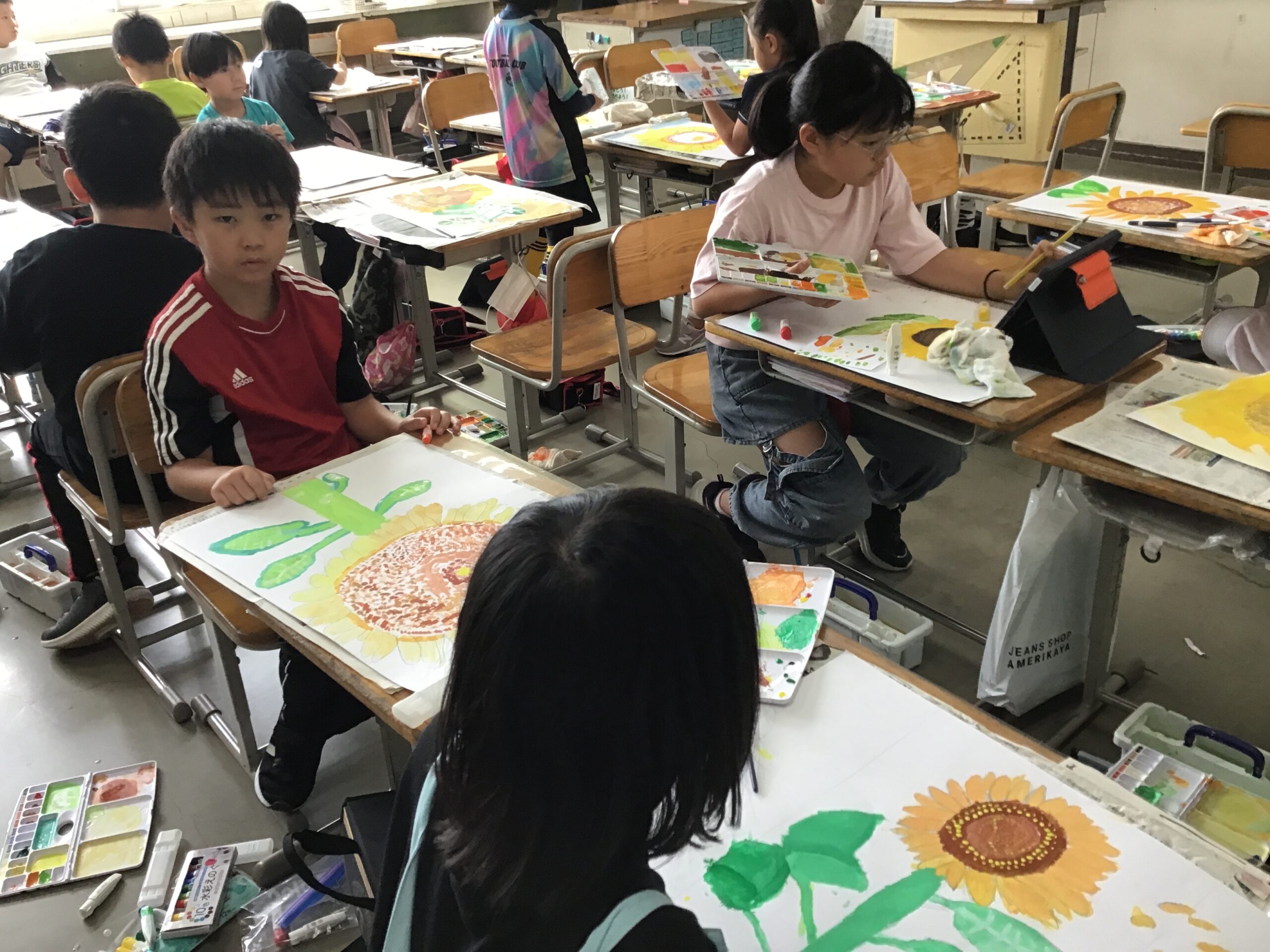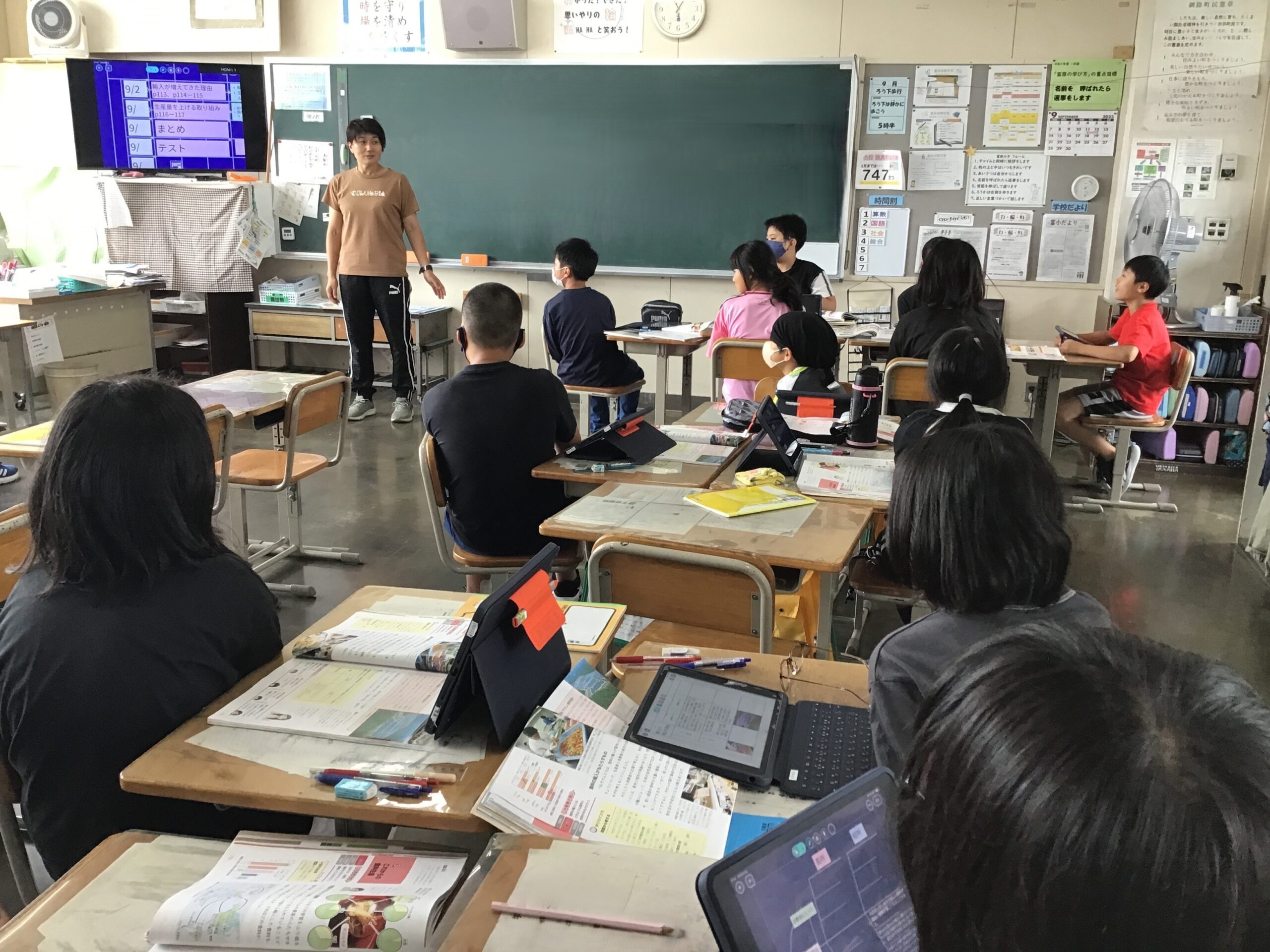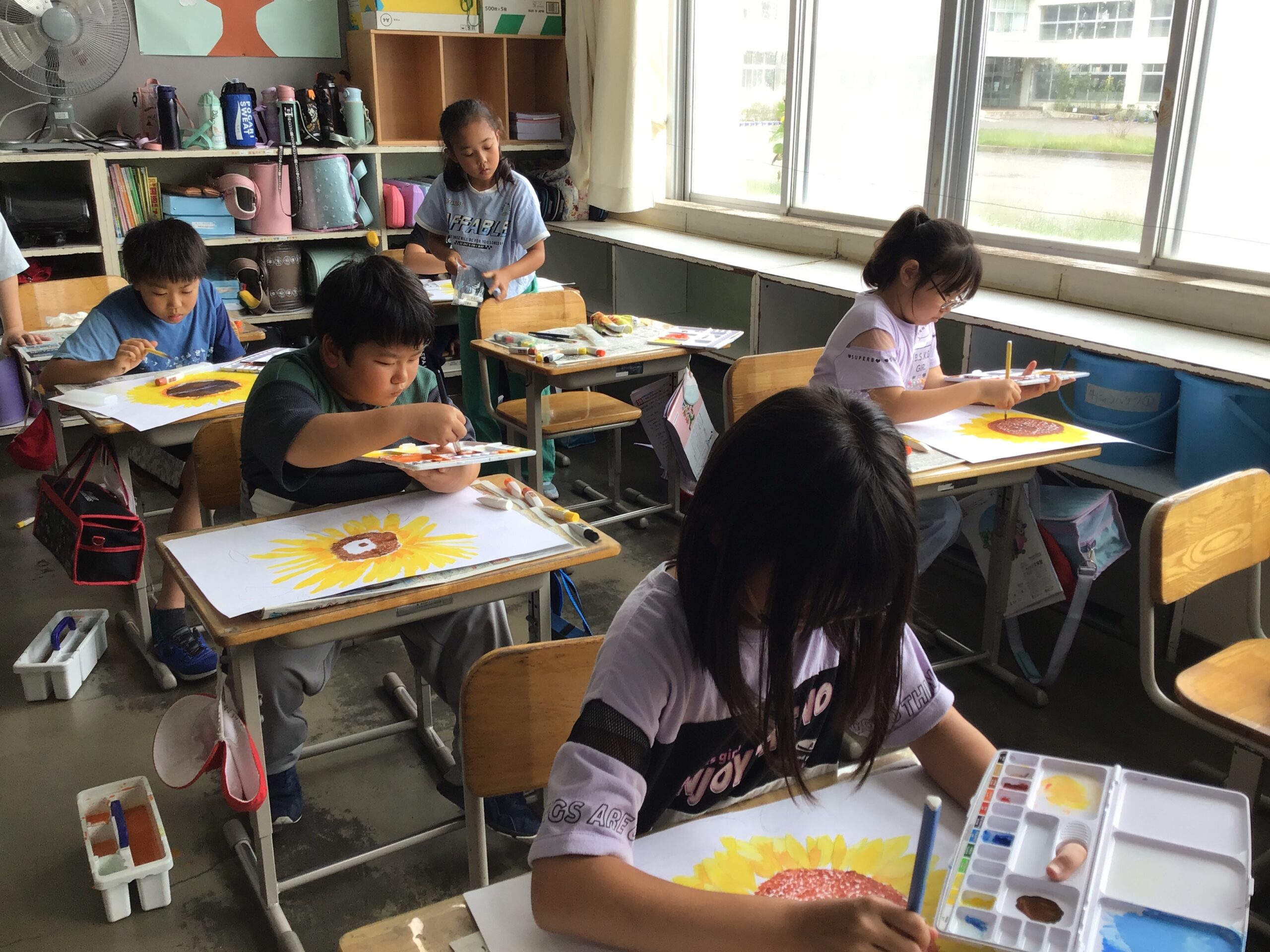 今日の子供たちの様子(9月9日) 2025/9/9 2025年9月 1年生は算数で3つの数の計算の学習をしています。2年生はきらり発表会の練習をしています。3年生は図工でひまわりの絵を描いています。4年生は総合、理科です。理科ではへちまの観察をしています。5年生は社会、6年生は算数の学習の様子です。