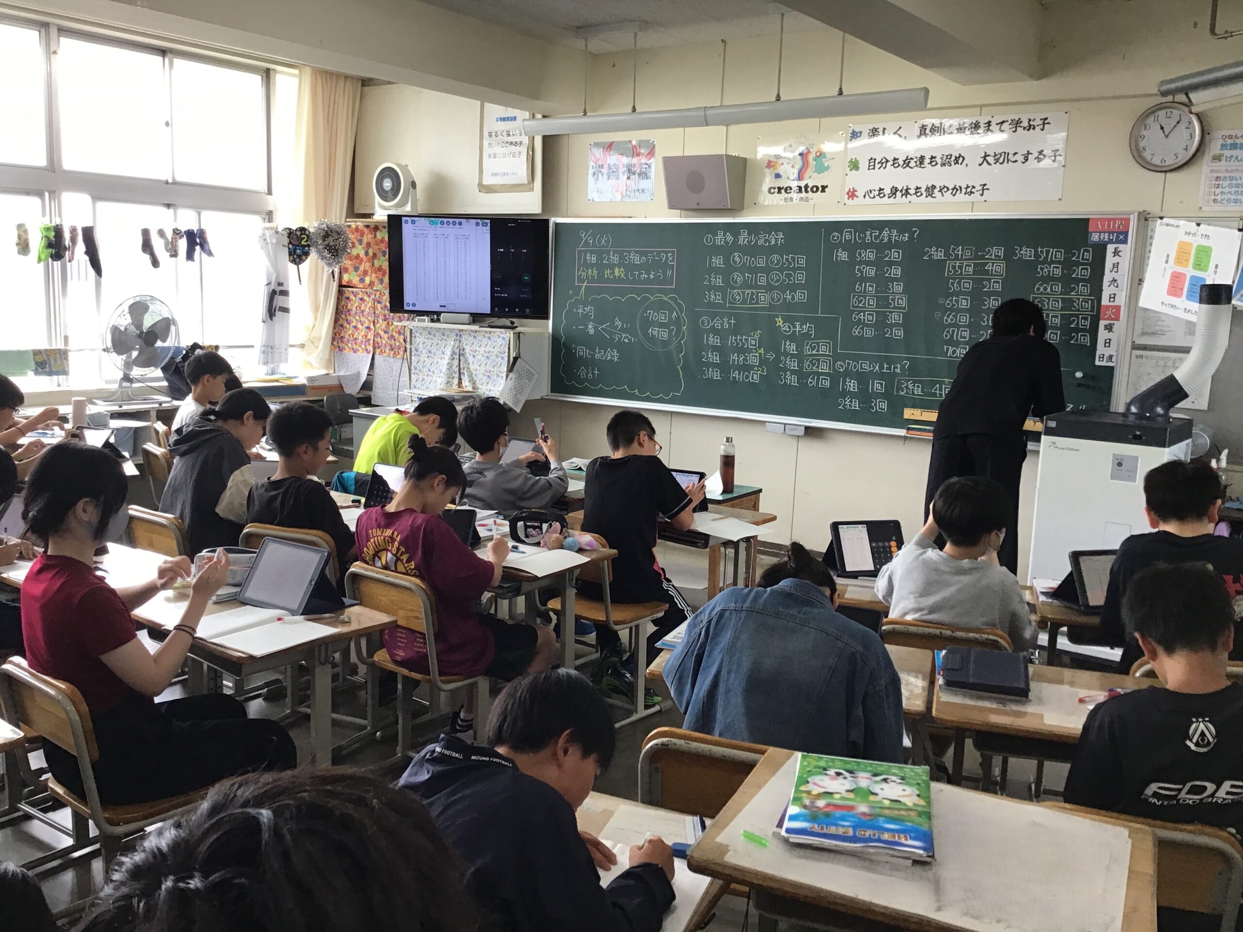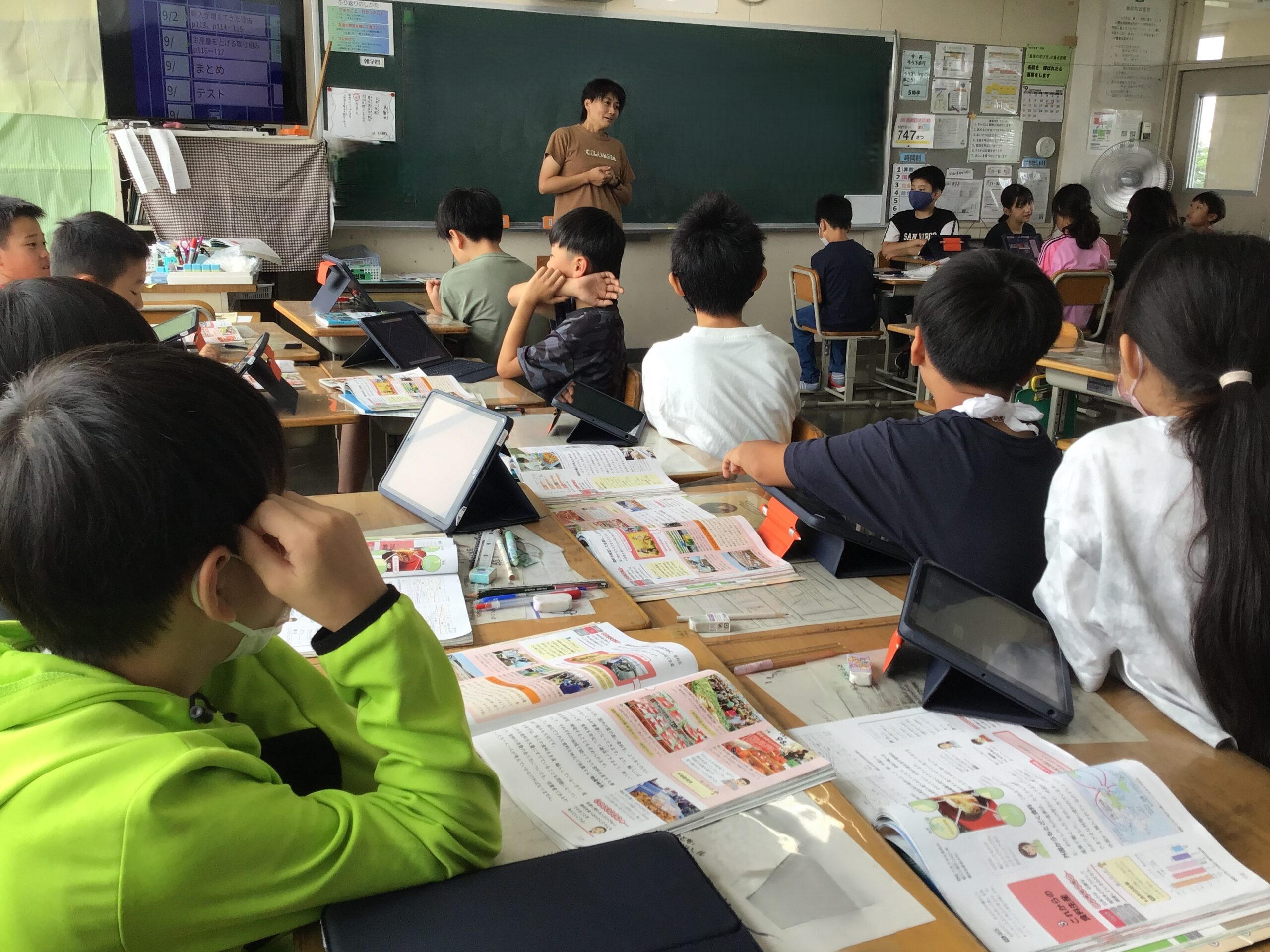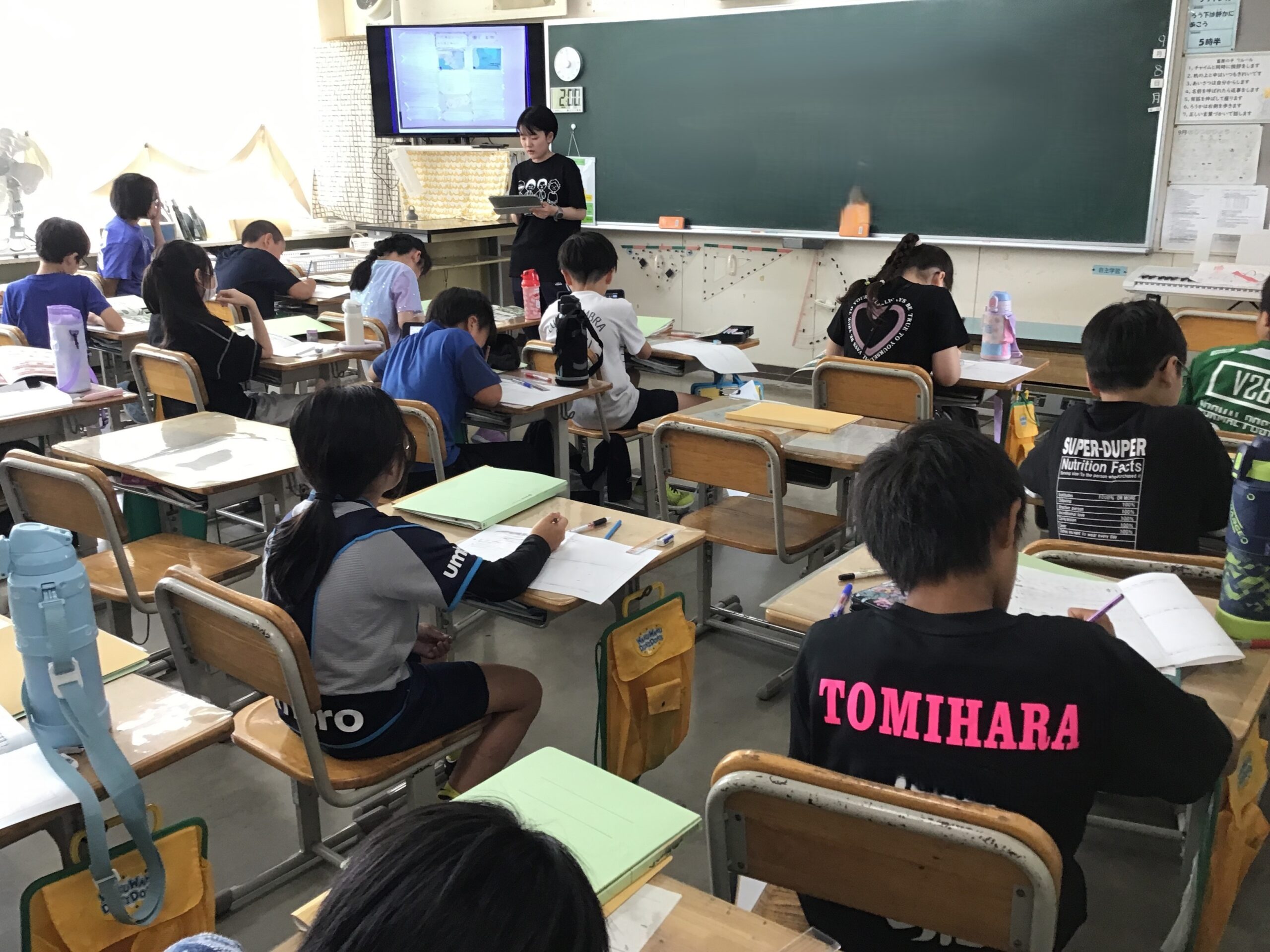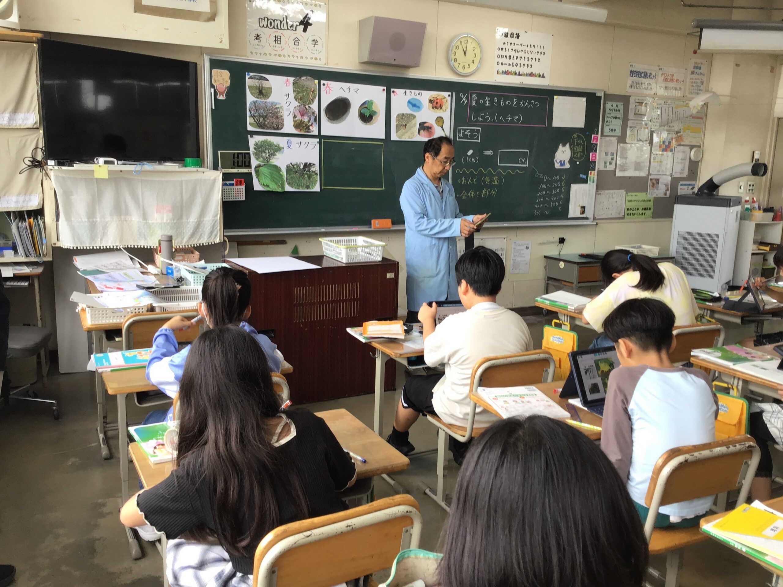 今日の子供たちの様子(9月9日) 2025/9/9 2025年9月 1年生は算数で3つの数の計算の学習をしています。2年生はきらり発表会の練習をしています。3年生は図工でひまわりの絵を描いています。4年生は総合、理科です。理科ではへちまの観察をしています。5年生は社会、6年生は算数の学習の様子です。