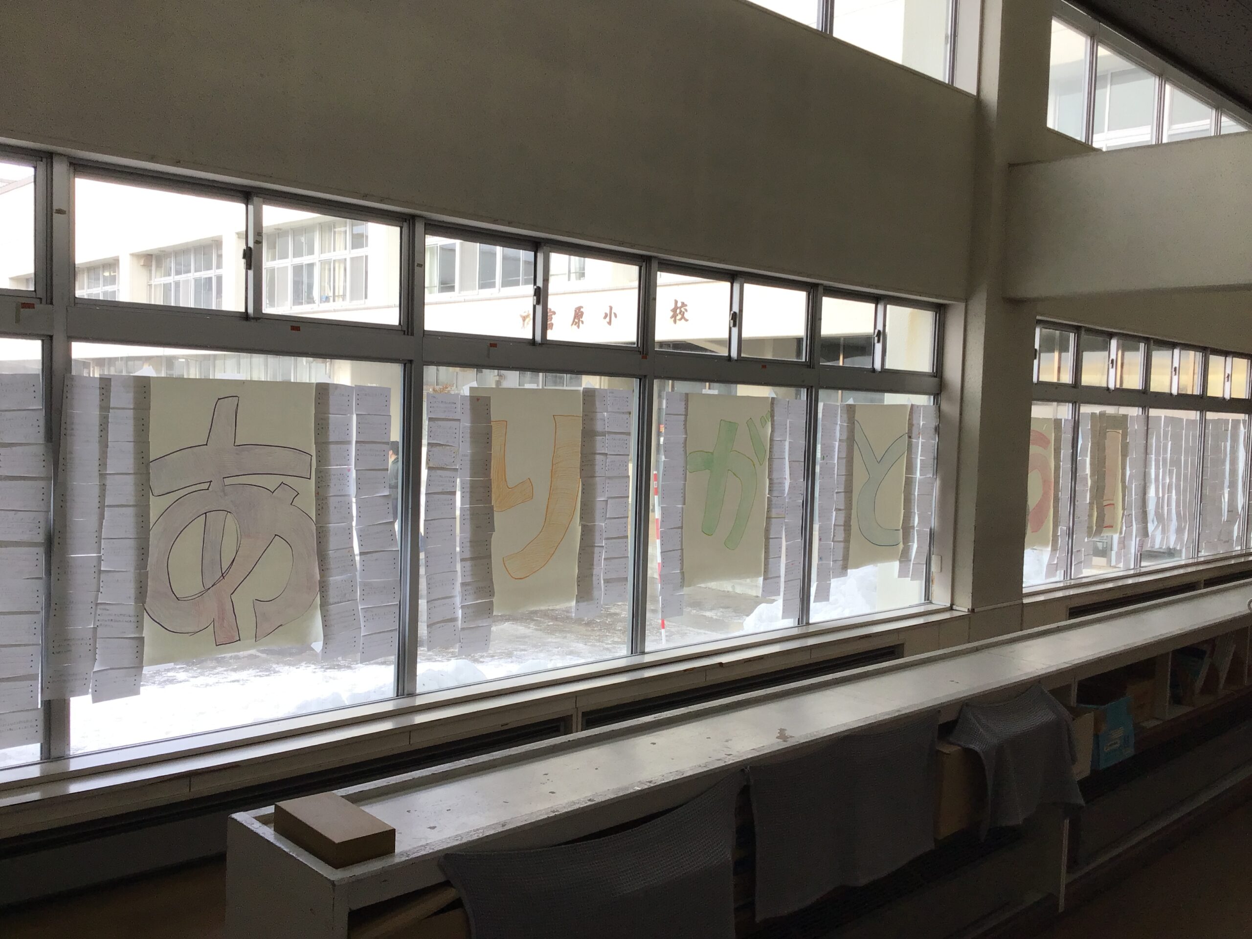 今、1年生プレールームの窓には、たくさんの「ありがとうカード」が貼られています。これは、12月8日(月)から19日(金)までの2週間、身のまわりの人へ感謝の気持ちを伝えようと、児童会事務局の子どもたちが企画してくれたものです。