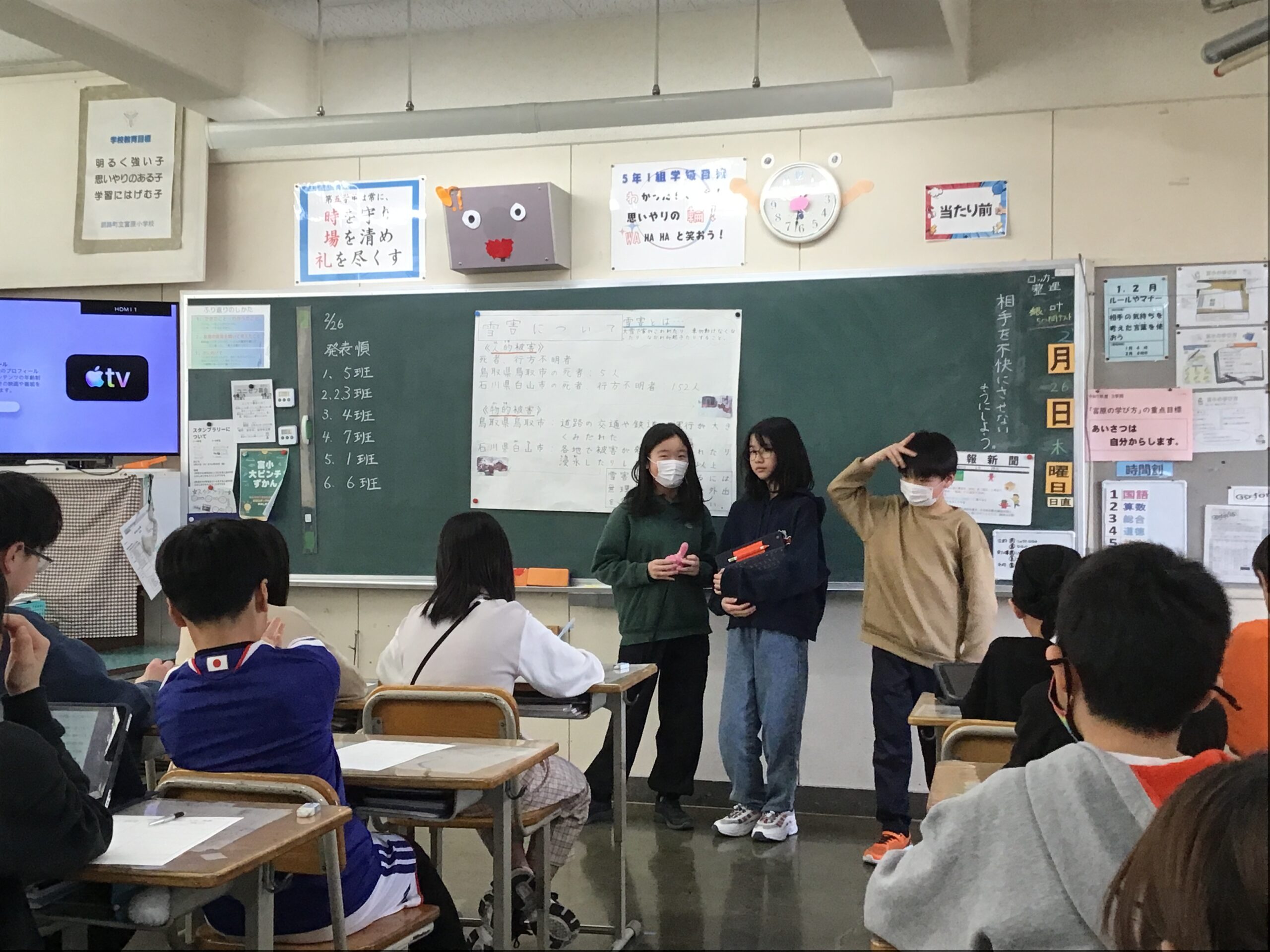 5年生は社会科の学習で取り組んできた「自然災害」について、班ごとに調べた内容をまとめ、発表会を行いました。地震・津波・暴風雪など、身近に起こりうる災害をテーマに、原因や被害の様子、そして私たちが備えるべきことを自分たちの言葉で伝えようとする姿が見られました。調べた事実を整理し、図や写真を使ってわかりやすく説明する力が育ってきていることを感じられる発表でした。