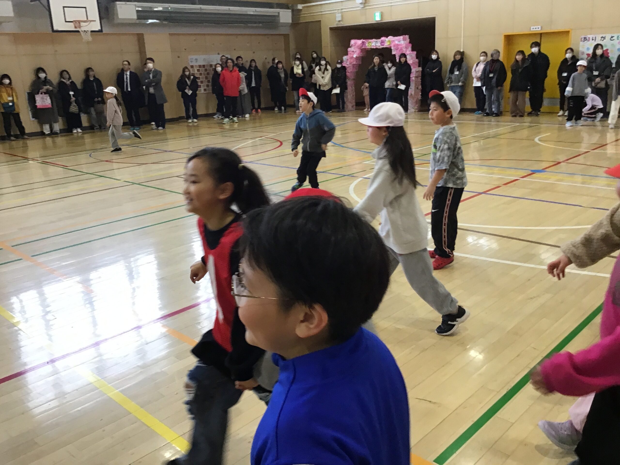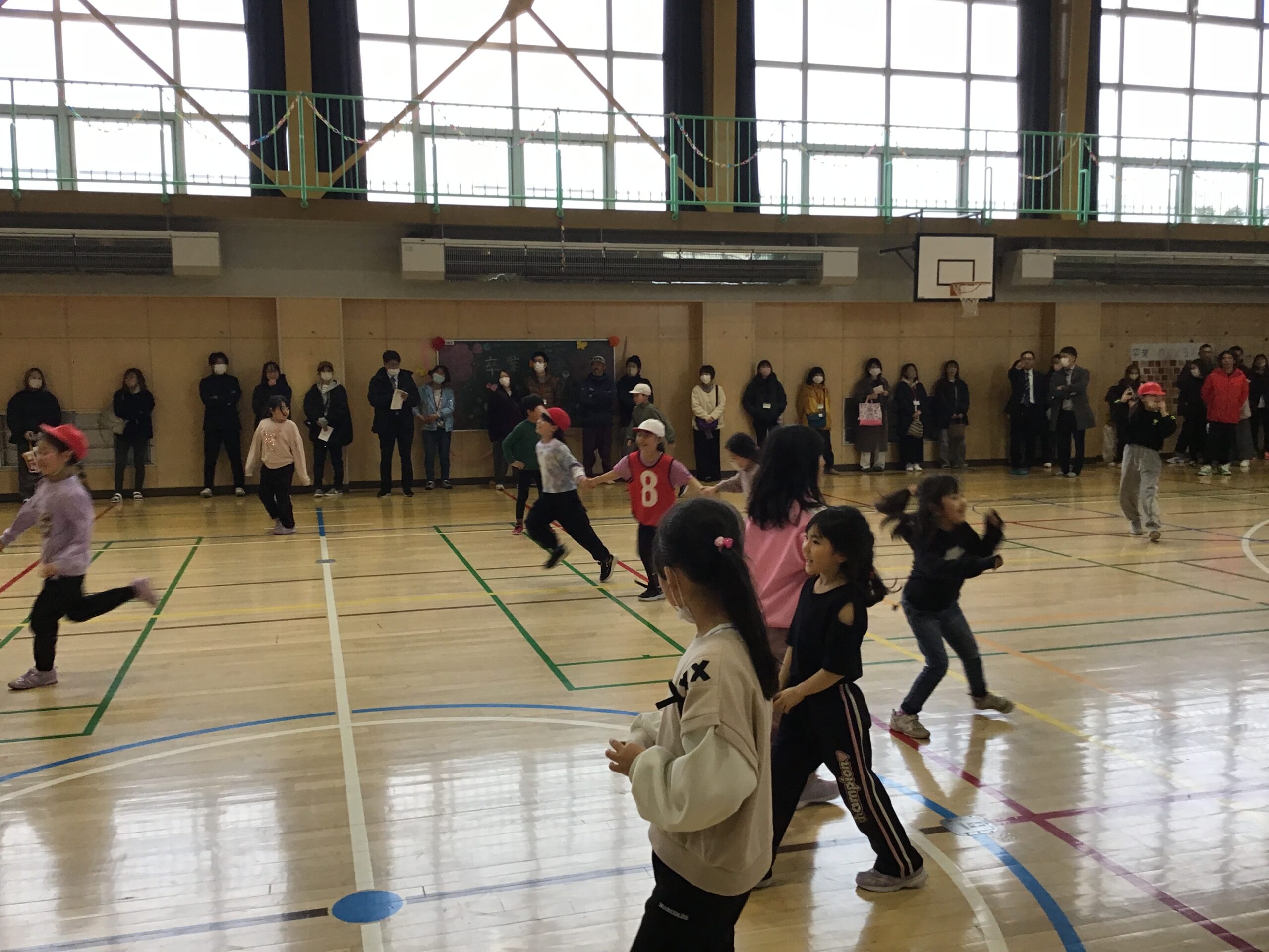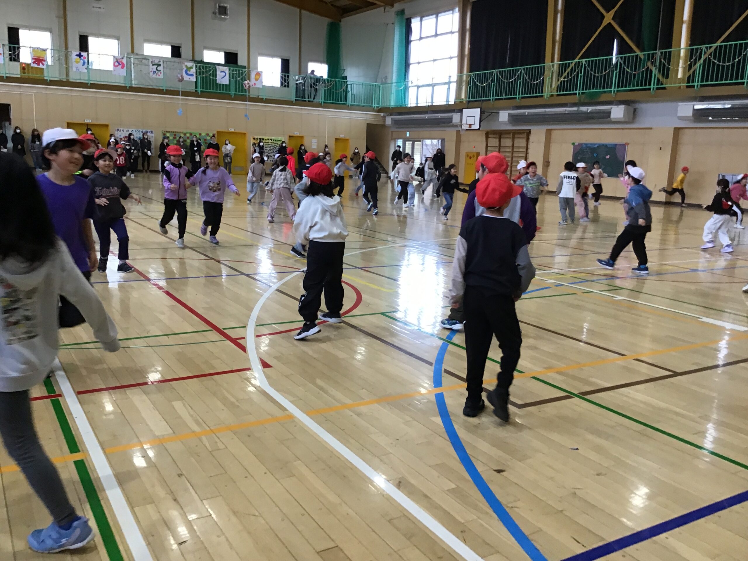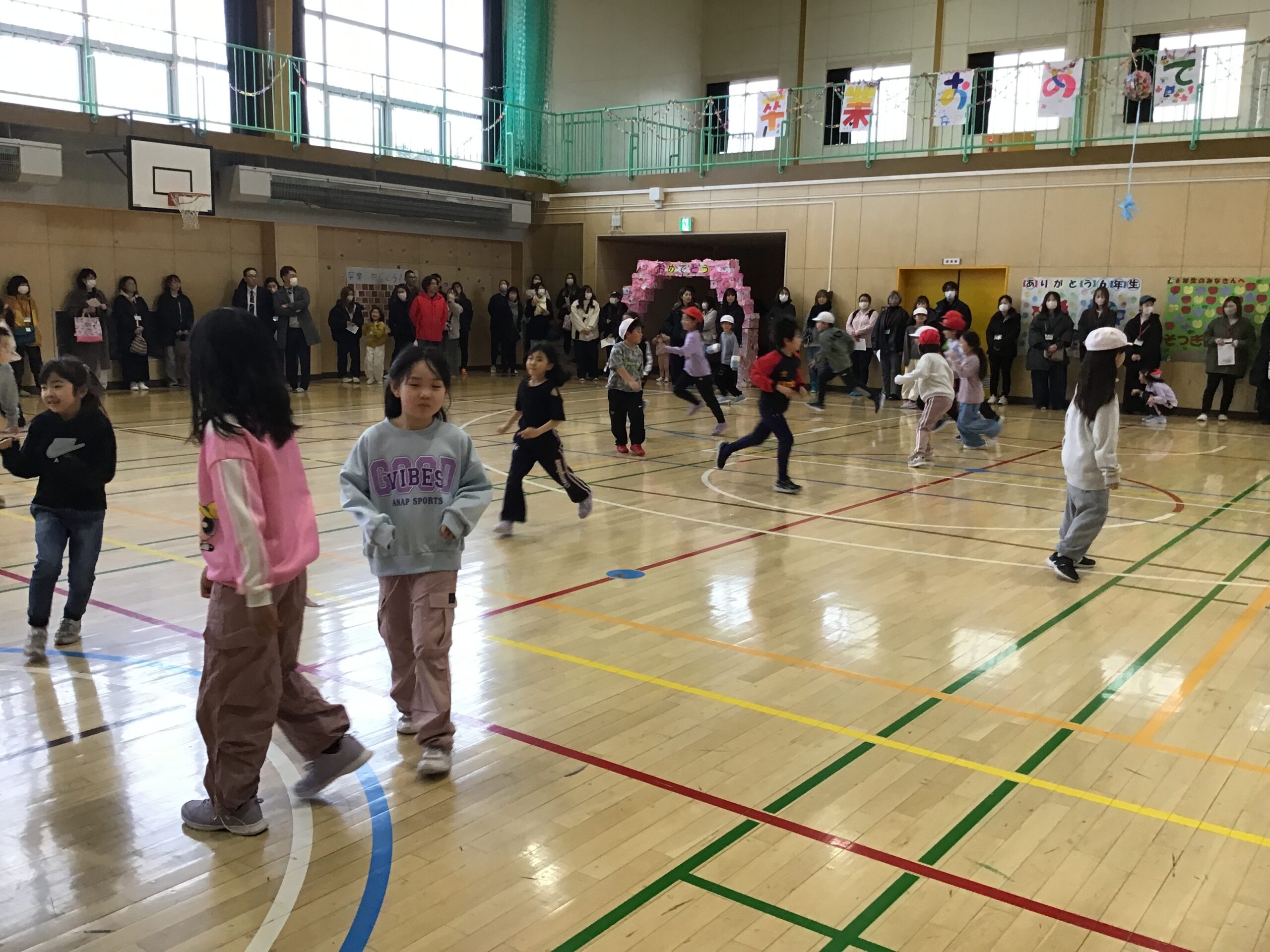 2年生は学年体育を行い、クラスの枠をこえて協力し合う姿をご覧いただきました。春からはクラス替えがありますが、学年全体で仲良く活動する姿から、これまで築いてきたつながりの深さを感じていただけたのではないでしょうか。